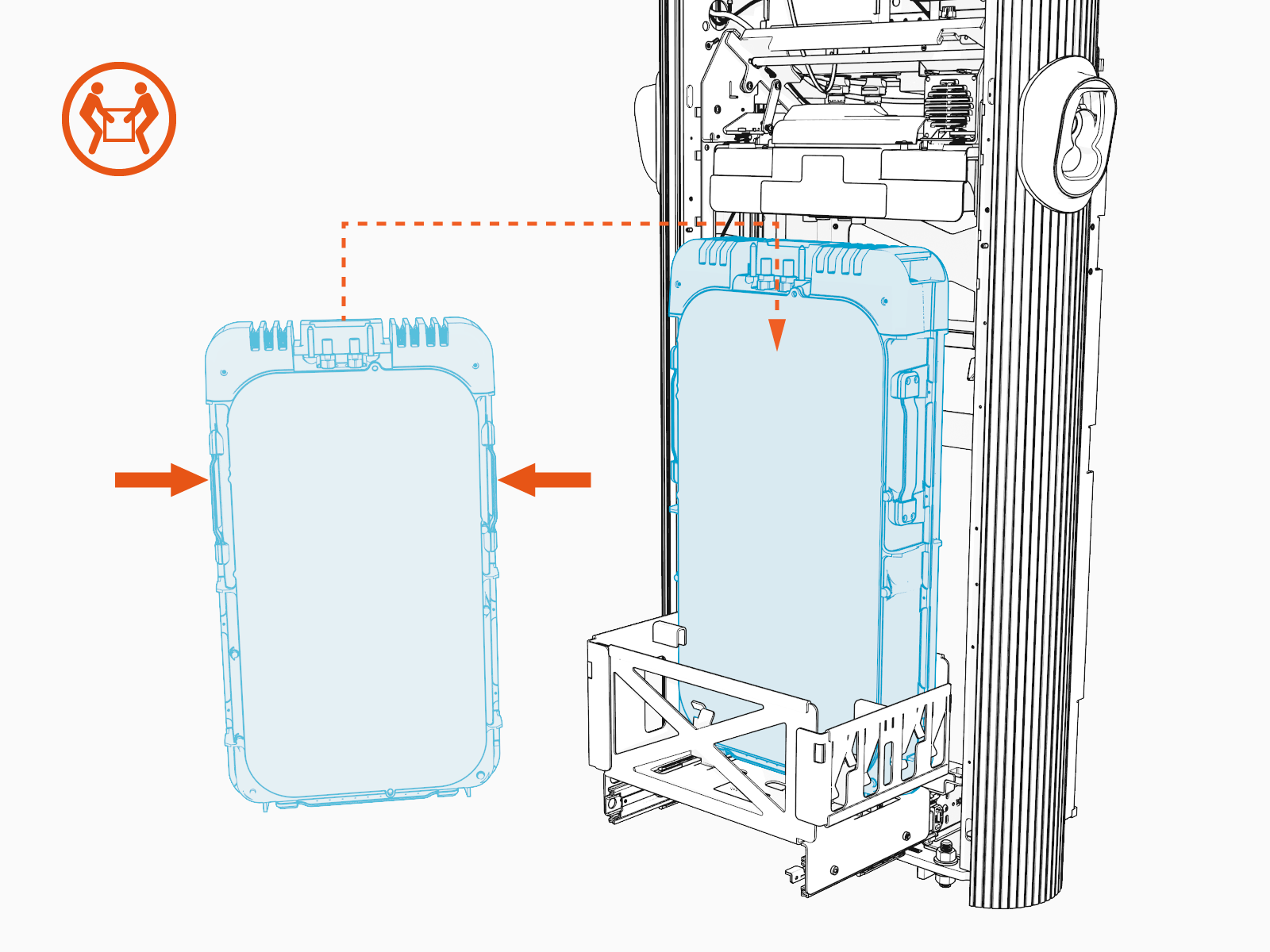 Using two people, lift the Power Module by its side handles and gently place it into its holder.