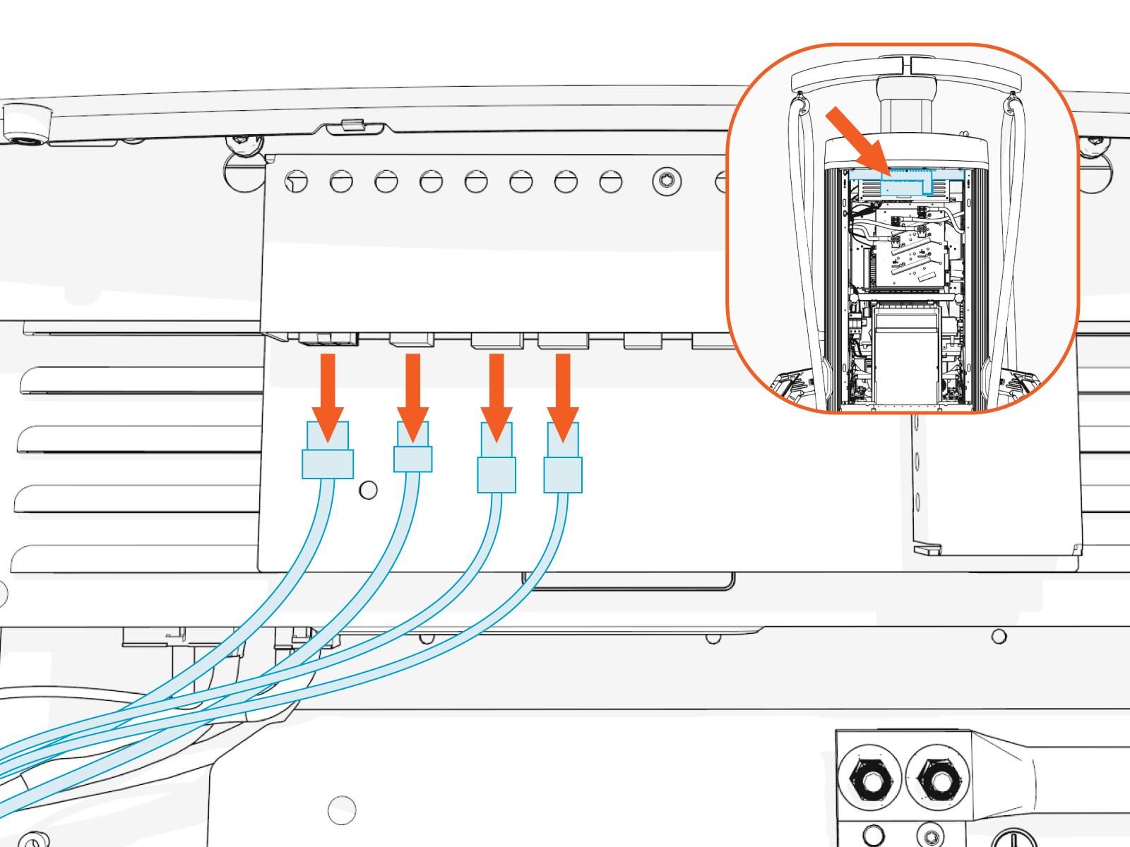 When reinstalling the area light bar, route the cable through the notch in the center of the area light bar. Ensure the cable does not get caught between the area light bar and the secondary display controller. Torque to 2.8 Nm (25 in-lb).