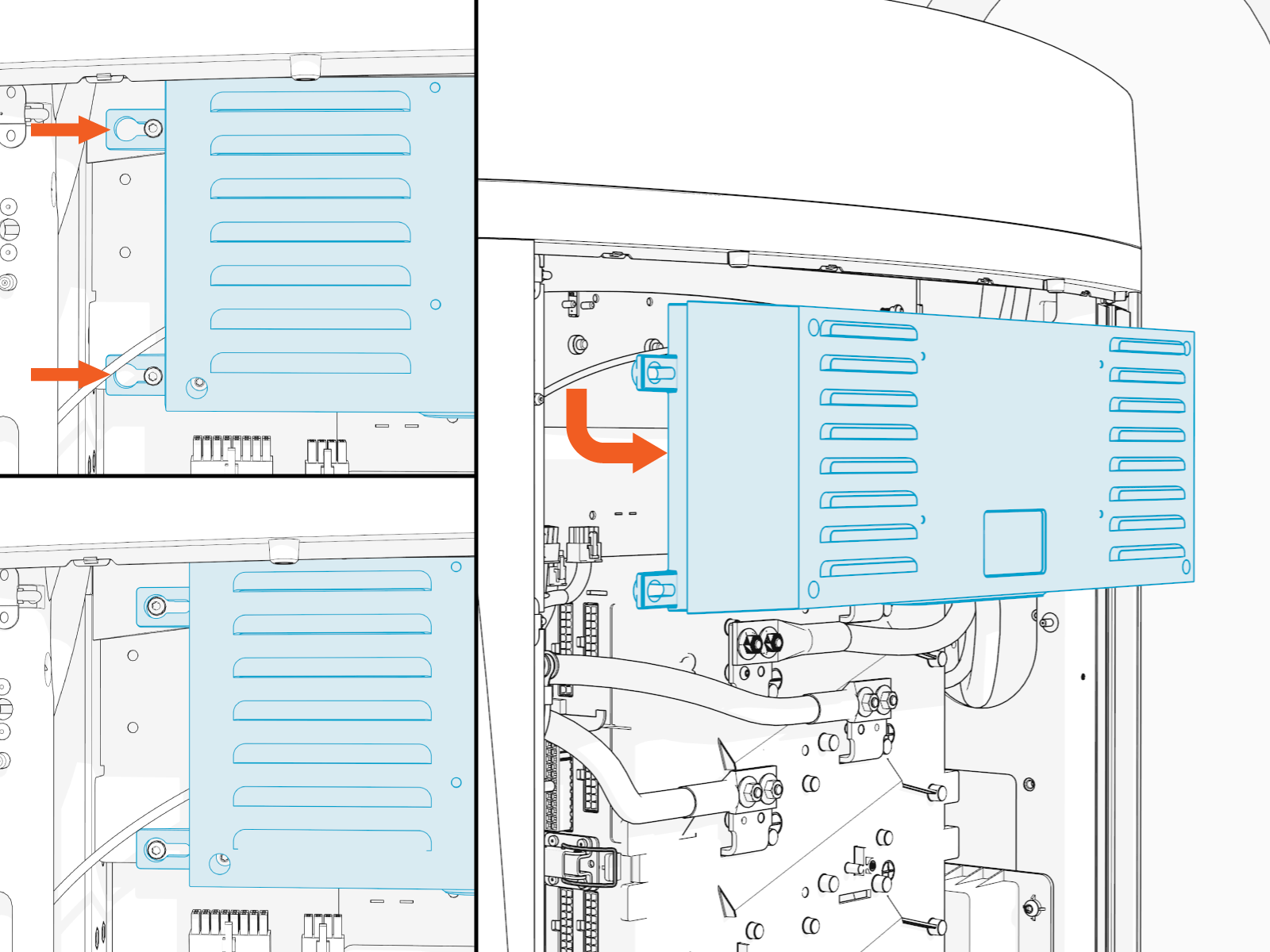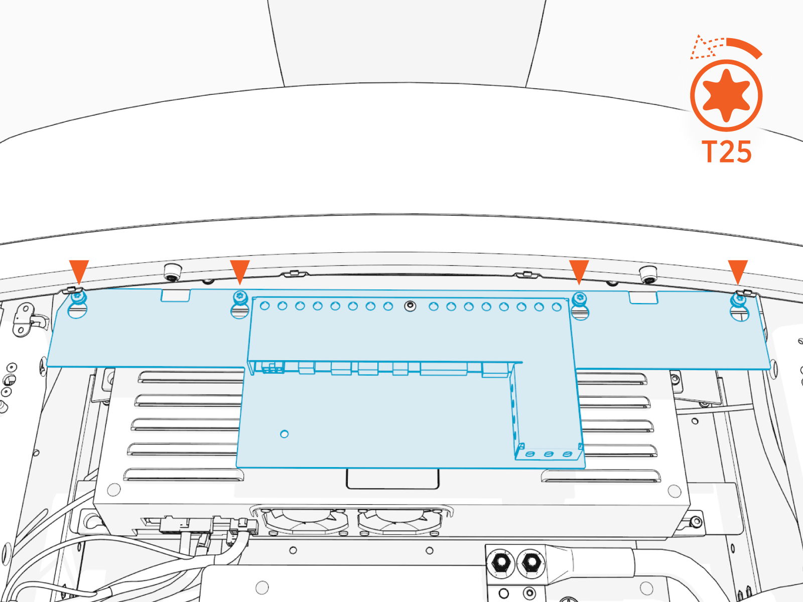 Use a T20 Torx screwdriver and four screws to secure the power supply. Torque to 2.3 Nm (20 in-lb).