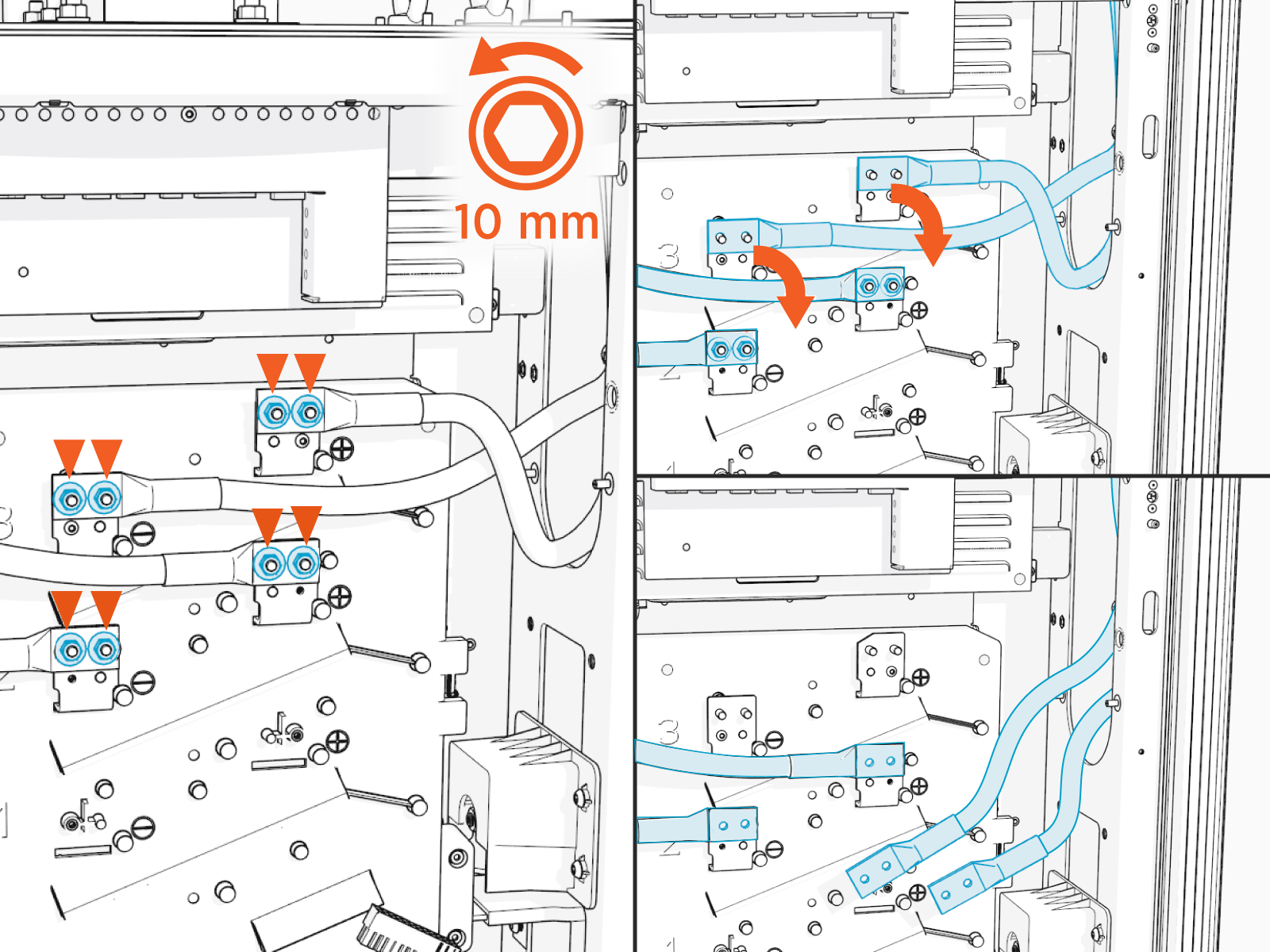 When you are connecting a charging cable on the right side of the station, use a 10 mm socket hex driver to connect the positive and negative DC conductors from the front tabs of the connector box to the upper set of connectors.