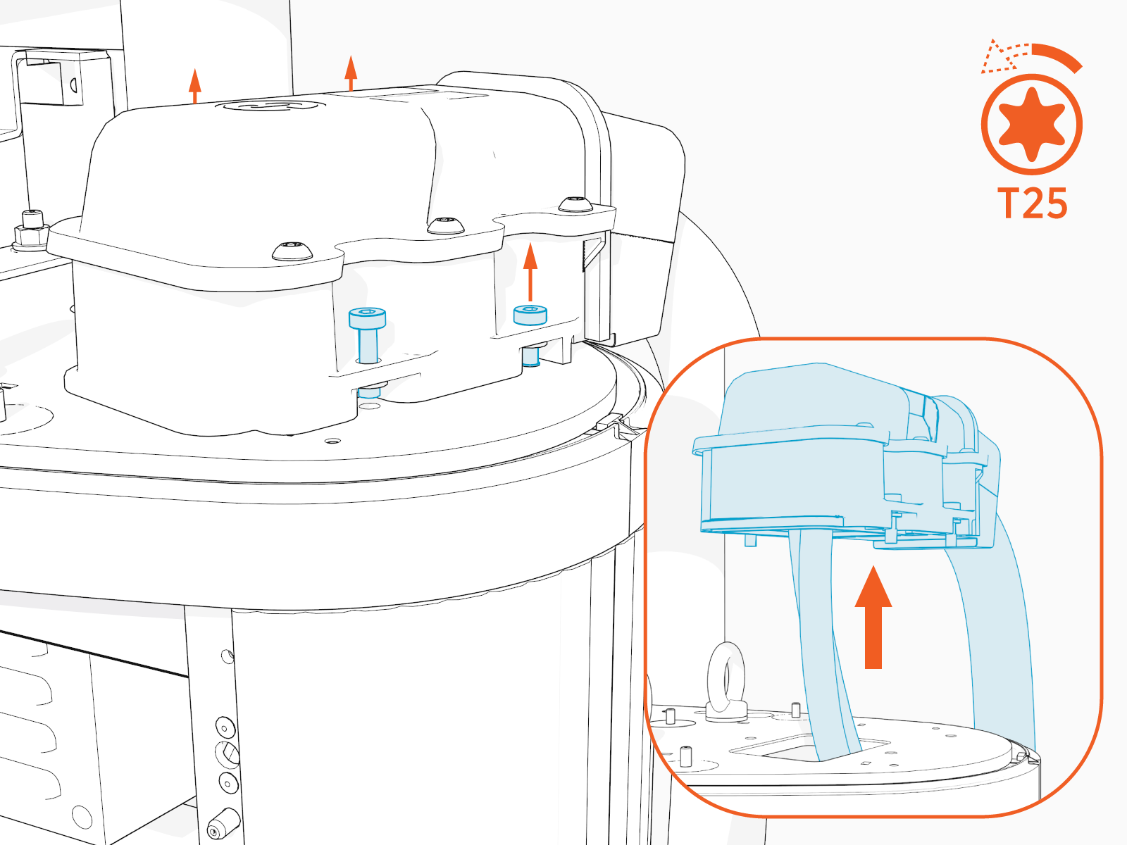 Use a T25 Torx screwdriver to loosen the four screws securing the top cap. Slide the latch to the right to release the tab.