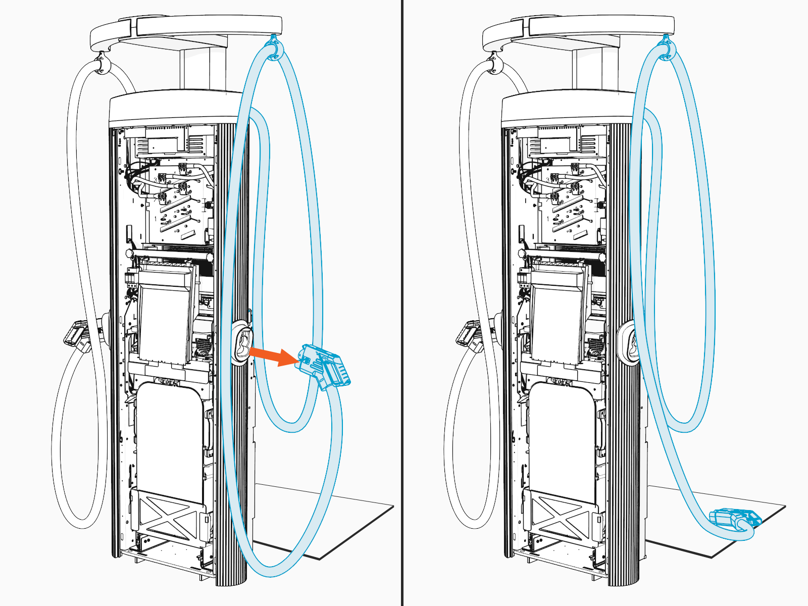 Combined Charging System is being installed on the left side when you are standing in front of the station, you do not need the data cable extension. Connect the data cable to the lower data connector.