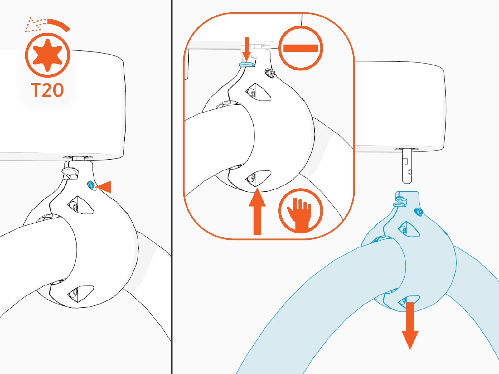 Use a T20 Torx screwdriver to loosen the set screw on the tether ball. Use a flat blade screwdriver to depress the spring while pushing the tether ball up to remove the tether ball.