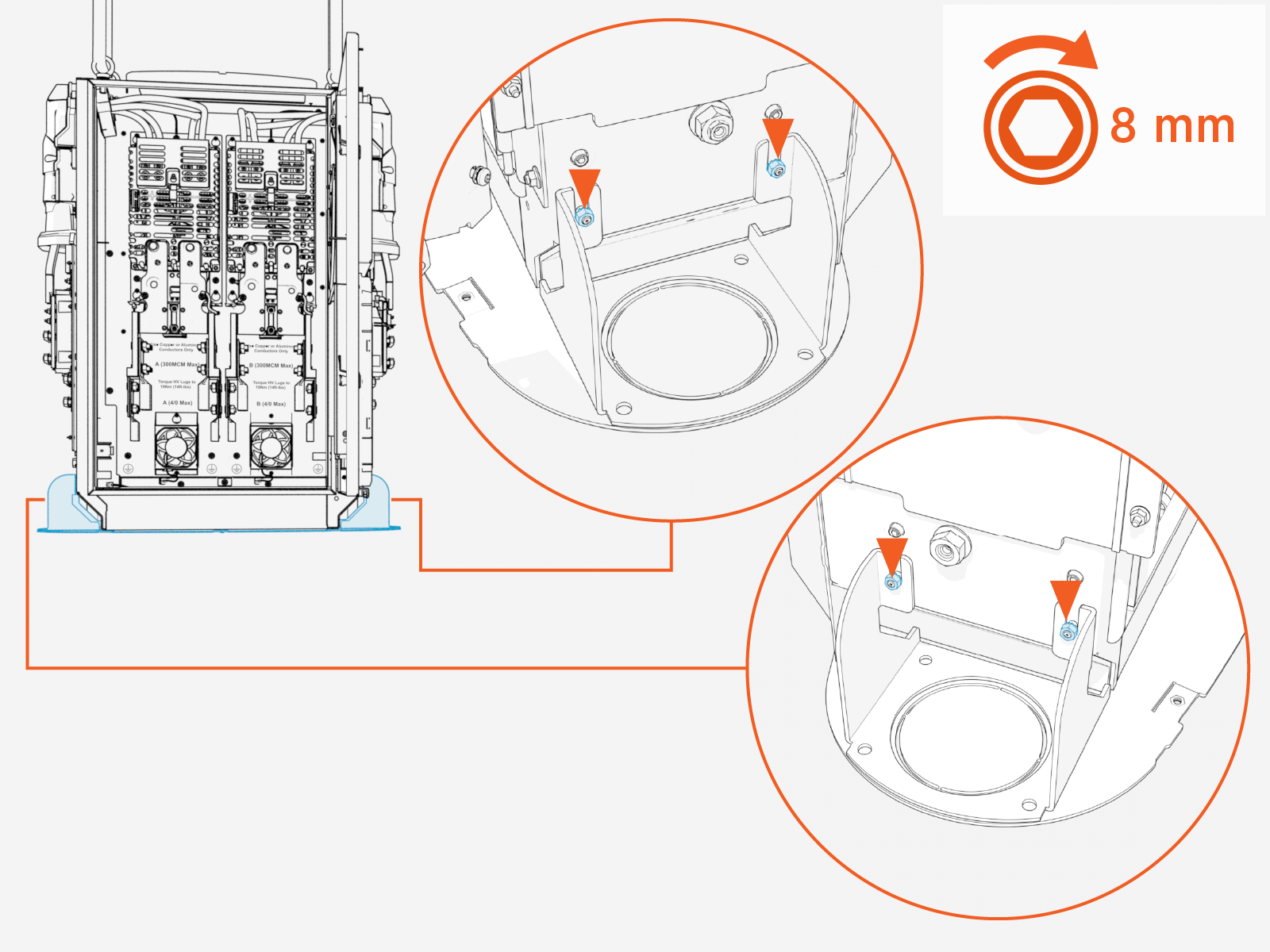 Attach the mounting bracket to the back of the Power Link 2000 with M6 screws (x8). Torque to 5.6 Nm (50 in-lb).