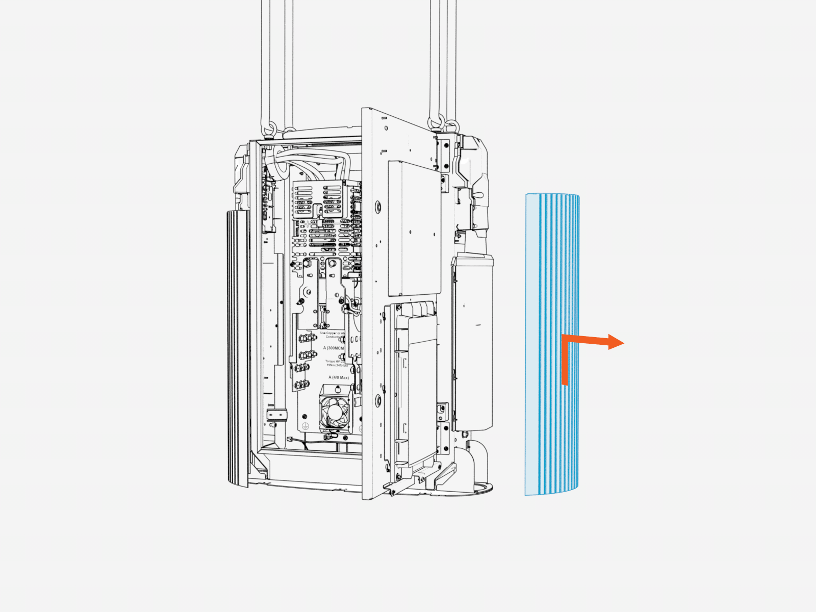 Slide the internal bus bar safety cover up to remove from hooks (x2) and latches (x2).