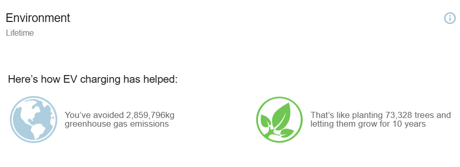 The Environment chart displays estimated Green House Gas (GHG) savings based on the energy dispensed by your organization’s charging stations. It estimates the distance an EV could travel using that energy, calculates the emissions from generating the electricity, and compares them to the emissions from a gas-powered vehicle covering the same distance. Actual emissions avoided may vary depending on your local electricity generation sources. For more information, refer to Greenhouse Gas Emissions Savings Report.