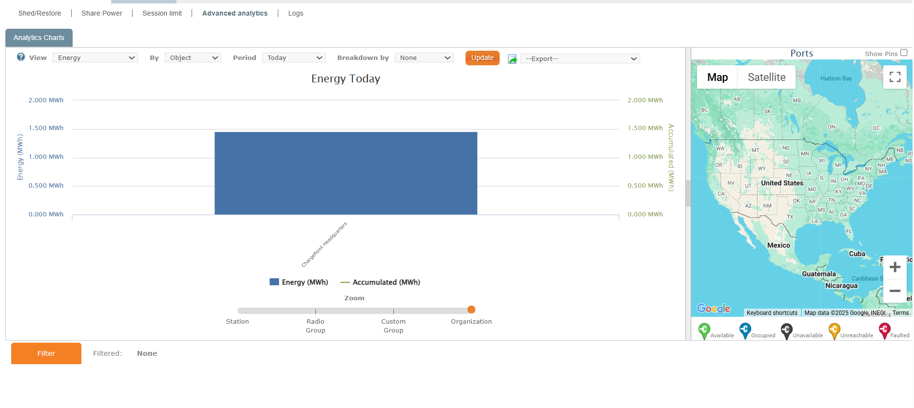 The Advanced Analytics tab provides a comprehensive view of energy consumption, station usage, and driver activities. It enables organizations to analyze charging patterns, optimize energy management, and generate reports for better decision-making. It provides real-time and historical energy usage in megawatt-hours (MWh), compares accumulated energy usage over different periods and helps organizations monitor and optimize power consumption. The key benefits include:
