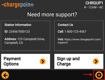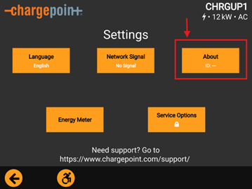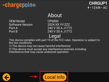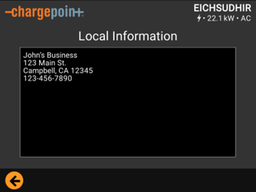 Users can navigate to Local Info> About page of the charging station screen, making this information relatively easy for regulatory agencies to find, but not immediately visible to drivers. If you want to display a custom message that will easily be seen by drivers, please see refer to Create a Station Message.